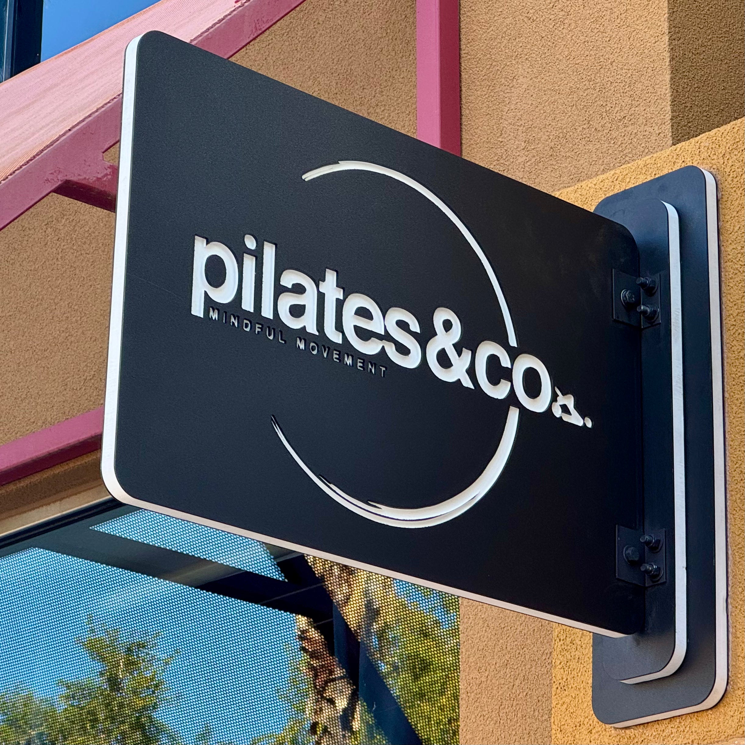Pilates & Co. - 16x20" outdoor blade sign carved on a CNC Router using 3/4" HDPE Color Core (Black over White).