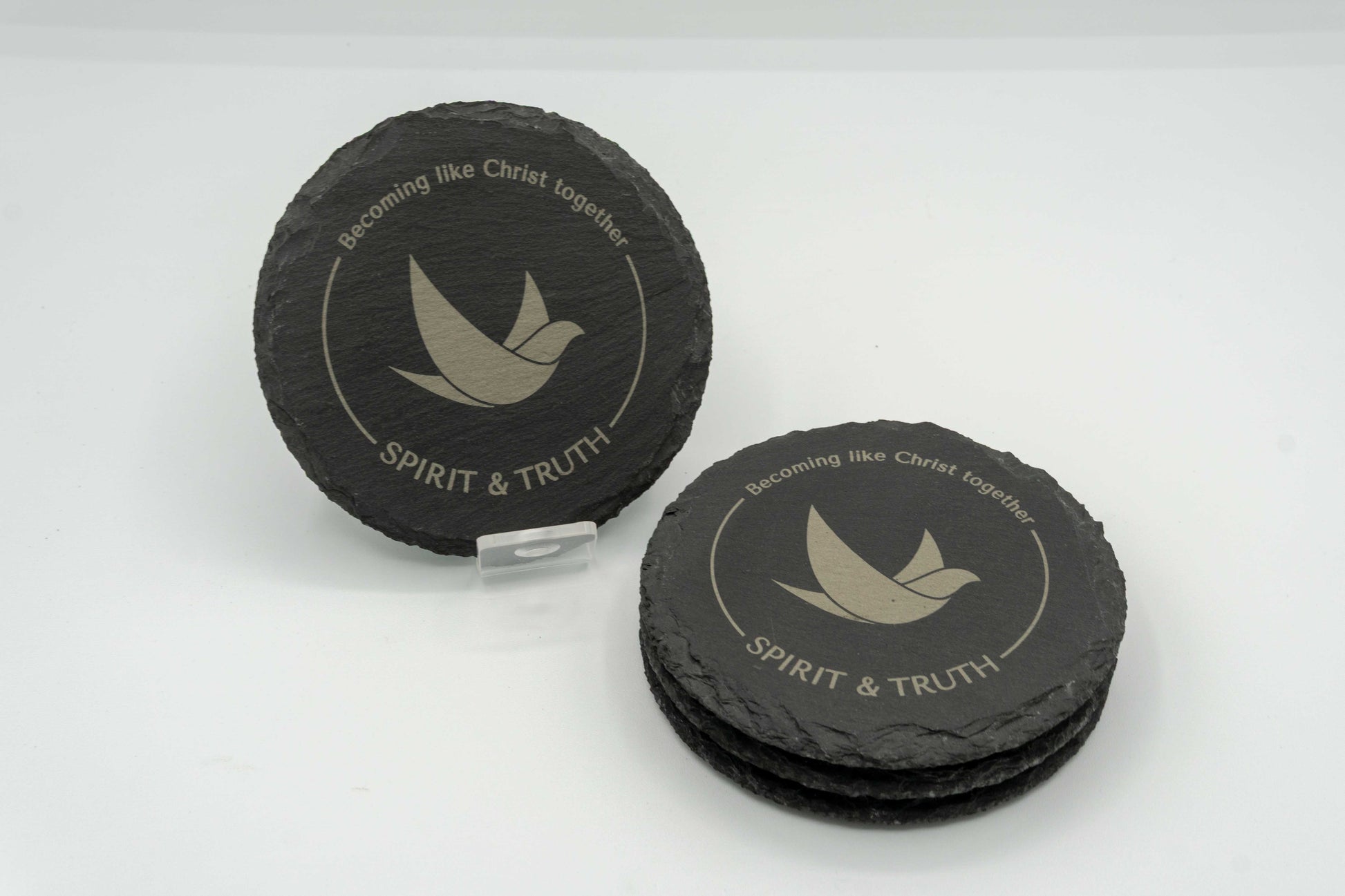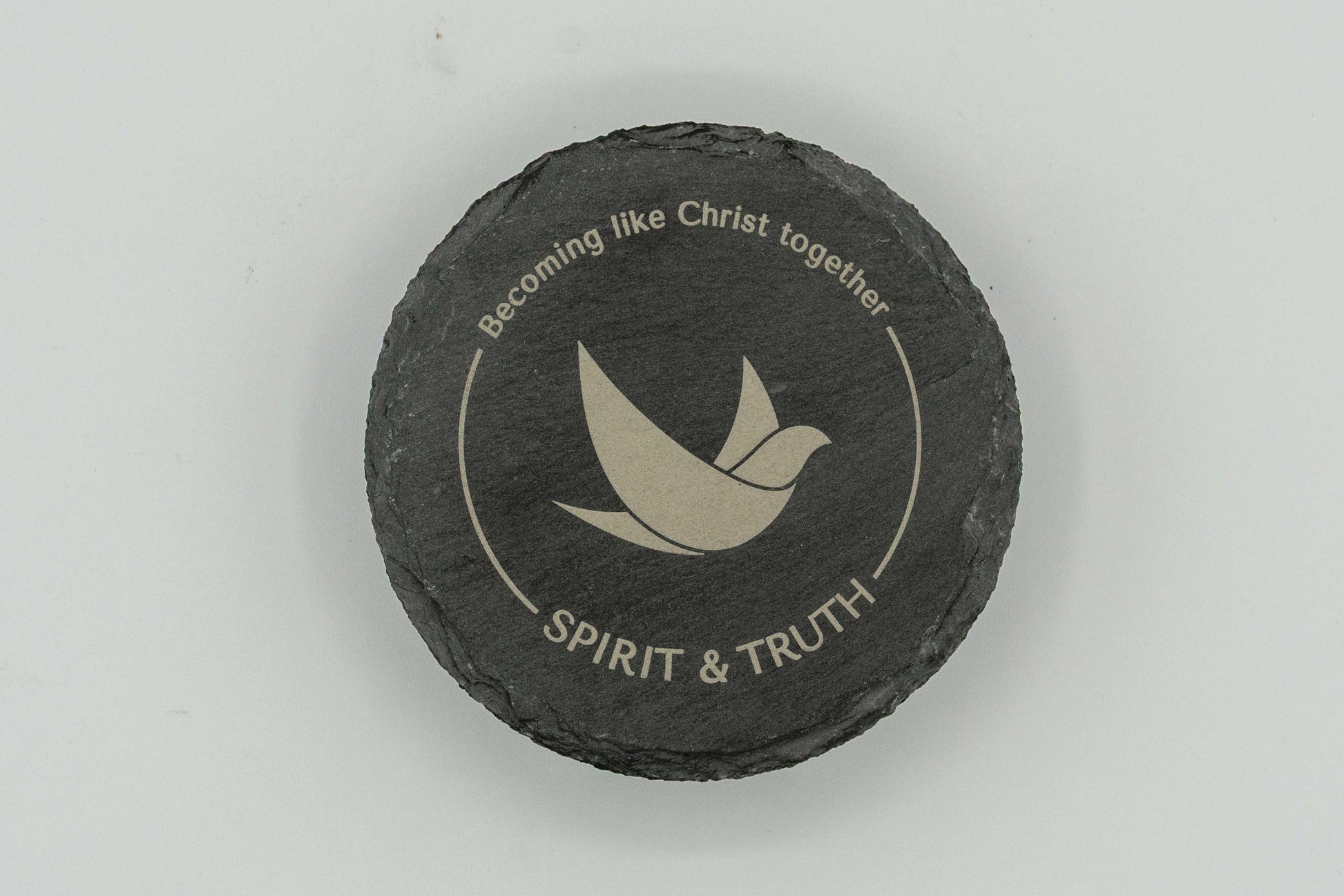 Set of Four (4) slate coasters (Round) with Spirit & Truth Fellowship logo and message "Becoming like Christ together"